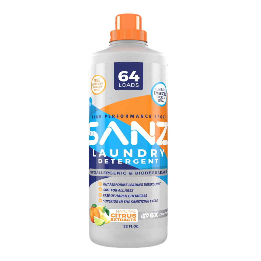 SANZ is a powerful and hypoallergenic laundry detergent that removes stubborn odors and stains without using harsh chemicals and without leaving a residue. SANZ preserves the integrity of all of your machine washable fabrics, is safe for all ages, and out-performed leading conventional detergents in 3rd party independent consumer product testing with only FOUR simple, plant-based ingredients (water, biodegradable DfE soaps, citrus extracts, and salts).